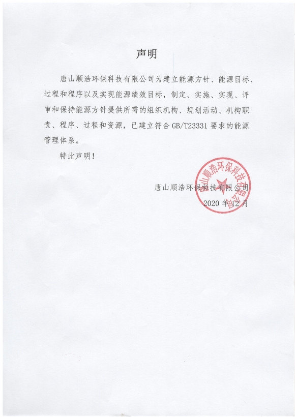唐山順浩環(huán)??萍加邢薰疽呀⒎螱B/T23331要求的能源管理體系,特此聲明。證明文件公示如下: